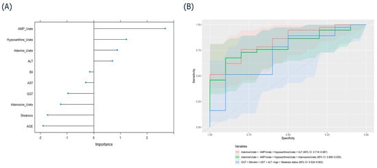 (A) Variable-importance plot derived from the random forest model. (B) Receiver operating characteristic (ROC) curve prediction of EGF based on the highest areas under the curve (AUC) with the combination of either clinical variables or metabolite ratios and the combination of metabolites and clinical variables. ALT, alanine aminotransferase; BiL, bilirubin; AST, aspartate aminotransferase; GGT, gamma-glutamyl transferase.