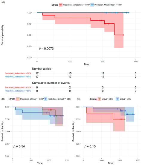 The purine ratio predictor (AMP/urate, adenine/urate, hypoxanthine/urate, adenosine/urate) stratified the participants: all five deaths occurred in the <50% strata, in which the metabolites predicted a lower chance of survival (Figure 3A; p = 0.073). For the clinical predictor (ALT, bilirubin, AST, GGT, steatosis status and donor age), three out of the five deaths occurred in the <50% strata, which indicates no significant prediction (Figure 3B; p = 0.54). Similarly, three out of five deaths occurred in the DBD group, and group class could not predict survival (Figure 3C; p = 0.15).