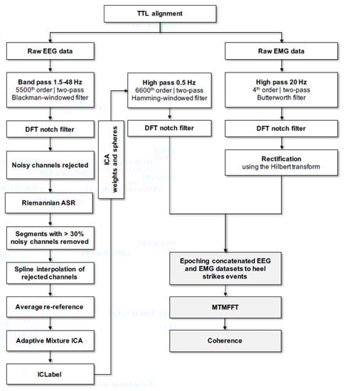 All signal processing was performed using custom-made scripts and Fieldtrip, an open-source toolbox for electrophysiological data analysis [62] for Matlab (Mathworks Inc., Natick, MA, USA). An overview of the adopted pipeline for data pre-processing, including spectral analysis (see Section 2.5.3. below) can be retrieved in Figure 2. After alignment of the EEG and EMG data according to the TTL pulse, EMG data was high pass filtered (two pass Butterworth filter, 4th order, 20 Hz cutoff) and powerline noise, as well as its harmonics were filtered out using a notch filter based on Discrete Fourier Transformation (DFT). Filtered EMG data was then full wave rectified using the Hilbert transform as a widely used preprocessing step before undertaking further coherence analysis [63]. Only straight parts of the figure-8 gait path were hence considered for analysis of the aligned EEG/EMG data. After removing mastoid electrodes from further analysis (M1 and M2), EEG data was then bandpass filtered (two pass blackman-windowed sync filter, 5500 order, 1.5–48 Hz cutoff) and concurrently demeaned as well as detrended. Powerline noise and harmonics were filtered out as described above. Noisy channels were detected and removed if they were flat for > 5 s or the correlation between neighboring channels was < 0.6. On average, ~1 channel was removed. Artifactual activity (e.g., movement artifacts) was attenuated with the following strategy. Firstly, a non-stationary method was employed to clean occasionally large amplitude noise and increase the stationarity of EEG data in preparation of the next Independent Component Analysis (ICA) cleaning step. For this purpose, a sliding window adaptive approach based on Principal Component Analysis (PCA) decomposition was used by means of the Riemannian modified version of the Artifact Subspace Reconstruction (rASR) method [64]. The entire data was used as calibration data and a lax threshold was chosen as parameter (30 standard deviations), as previously recommended, to be large enough to reduce artifactual activity from EEG data while preserving cerebral activity [29,65]. The combined used of ICA and Artifact Subspace Reconstruction has been suggested to represent an effective strategy to remove artifactual signals from EEG data [66] and it has been largely used in studies involving cleaning of EEG data acquired during human locomotion tasks such as gait [29,37,67,68,69,70]. Portions of data not completely repaired by rASR were removed if more than 30% of channels were noisy in that data segment. Previously rejected noisy channels were then interpolated using spline interpolation and afterwards EEG data was re-referenced to an average reference and then EEG signals were decomposed into temporally maximally independent components (ICs) by applying on the remaining rank of the data Adaptive Mixture ICA (AMICA) with enabled online artifacts rejection using a threshold of five standard deviations in five iterations intervals starting after the first five iterations and the whole procedure repeated five times. AMICA algorithm was chosen given that it has been shown to outperform other ICA algorithms [71]. After AMICA, a machine learning based approach was used to identify cerebral ICs by employing the ICLabel classifier [72]. On average, ~6 cerebral ICs were identified by ICLabel which was in line with the suggested ~5–15 range of brain ICs that can be detected reliably [73]. The respective ICA weights and spheres matrices of the retained cerebral ICs were conveyed to an EEG dataset identical but processed using a more conventional filtering approach (high pass filter: two pass hamming-windowed sync filter, 6600 order, cutoff 0.5 Hz; powerline noise filtered as in the EMG analysis described above). In the present study, we have chosen to focus on the EEG Cz electrode for further spectral analysis of CMC. This vertex located sensor is widely employed to assess CMC during gait, as well as during isometric contraction tasks using lower limbs’ muscle, such as ankle dorsiflexors [28,47,48,50,74,75,76,77]