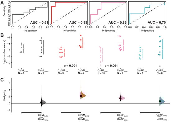 Results relative to the log-transformed coherence area (sum of coherence above significant confidence limits) between the EEG Cz sensor and the muscles located in the upper part of the lower limb: Vastus Lateralis (Cz-VL), Vastus Medialis (Cz-VM), Biceps Femoris (Cz-BF) and Rectus Femoris (Cz-RF). (A) shows the ROC curve with the respective accuracy (i.e., AUC estimate) depicted within the plot, precision (i.e., 1-specificity) shown on the x-axis while sensitivity presented in the y-axis. The dotted diagonal line depicts the 50% chance of differentiating between sarcopenic and non-sarcopenic older adults. (B) Cumming estimation plots showing mean differences of the log-transformed coherence area plotted in the upper axes separately for both sarcopenic (SARC, darkish color) and healthy control older adults (CTRL, light color). Each mean difference is represented by dots and plotted on the (C) lower axes as a bootstrap sampling distribution, while the ends of the vertical error bars denote the 95% confidence intervals.