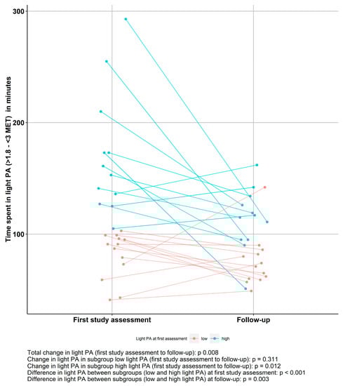 As shown in Figure 1, total time spent in light PA in AN patients decreased significantly between the first study assessment and follow-up (p = 0.008). Nevertheless, at follow-up a significant difference between low light PA and high light PA patients remained, as high light PA patients continued to show higher levels of light PA at follow-up (p = 0.003). When analyzing the subgroups separately, the decrease in light PA over time was only significant in the group with high baseline light PA (n = 12, p < 0.001), and not in the low light PA group (n = 13, p = 0.147).