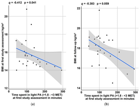 The time spent in light PA at first study assessment showed a significant association with BMI at admission (p = 0.041), while time spent in light PA at admission and the BMI at outpatient follow-up were only associated trend-level significance (p = 0.059) (Figure 2).