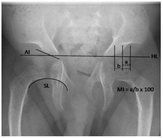 Plain radiographs were digitally transferred and evaluated by one experienced pediatric orthopedic surgeon using Centricity PACS Universal Viewer (Version 5.0, GE Healthcare, Little Chalfont, United Kingdom). Radiographic evaluations were performed on supine anteroposterior (AP) pelvic radiographs. Hip morphology was analyzed quantitatively by: the acetabular index (AI) as described by Tönnis, the Reimer’s migration index (MI), the femoral neck-shaft angle and the Shenton’s line (Figure 1) [15,16,17]. The AI is formed by a horizontal line connecting both tri-radiate cartilages (Hilgenreiner line) and a second line, which extends along the acetabular roofs (Figure 1). The AI is age-, sex- and side-dependent and should become progressively shallower with age. Hip dysplasia was defined by the AI in correlation with reference data by Novais et al. [18]. The MI is the ratio of the uncovered femoral head part to the total femoral head width [16]. Therefore, it describes a relation between acetabular coverage and positioning of the femoral head. The reference range of a healthy population is 17–26% [19]. The anatomy of the femoral neck was described by the femoral neck-shaft angle. It was classified as physiological (angle within reference range) or as varus (angle below reference range) or valgus (angle above reference range) deformity [15]. The Shenton’s line was drawn as a curved line along the inferior border of the superior pubic ramus and the medial border of the femoral neck and subsequently classified as continuous or disrupted [20]. The following radiological findings were assessed qualitatively: rickets/hyperparathyroidism-like changes (subperiosteal or intracortical bone resorption with areas of cystic lucency and osteopenia), cloaking of the femur, femoral bowing, irregularities of the metaphysis or of the epiphysis of the proximal femur (flattening of the epiphysis, pathological ossification), the shape of the femoral neck and the configuration of the os ilium (constriction of the supra-acetabular portion of the pelvis, flared iliac wings). Patients without an ossified nucleus of the epiphysis were excluded from MI and femoral head assessments.