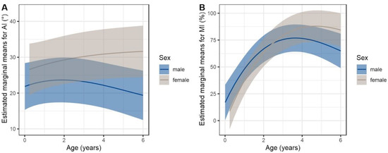 Estimated marginal means from final linear mixed model using spline functions for age. Trajectories differ significantly between sexes. (A) Acetabular index (AI) (LRT p = 0.016); (B) Migration index (MI) (LRT p = 0.036).