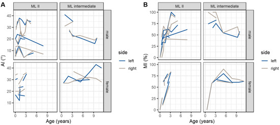 Comparison split by type and sex. Development of single left and right hips displayed by measurements over time. (A) acetabular index (AI); (B) migration index (MI).