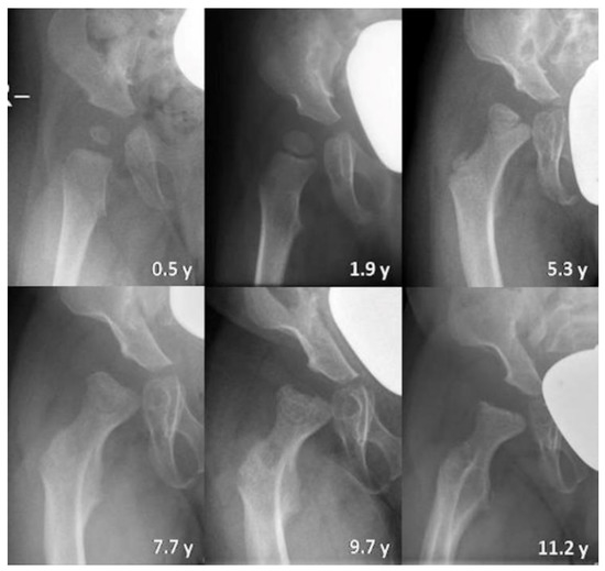 Hip development in a female ML intermediate patient (n 16) illustrated by plain radiography of the right hip at different years of age (y). Physiological measurements change into hip dysplasia with progressive pathological ossification of the femoral head and increasing constrictions of the supra-acetabular part of the os ilium and the femoral neck. The migration index increases but this does not result in high hip dislocation.