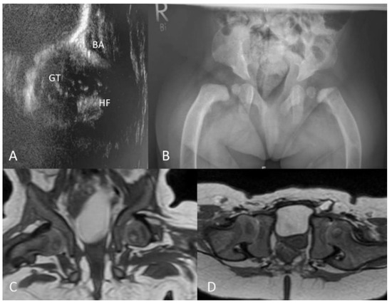 Hip morphology in a female MLII patient (n 3). (A) Ultrasound of the right hip at 1 week of age with an overriding greater trochanter; GT, greater trochanter; HF, head of the femur; BA, bony acetabulum. (B) Plain radiograph of the pelvis at 8 months of age presenting flared iliac wings, femoral bowing, an increased acetabular index, but a continuous Shenton’s line. (C,D) Magnetic resonance imaging (MRI) of the pelvis at 8 months of age, T2 weighted, in coronar and transverse views showing centered hip joints.