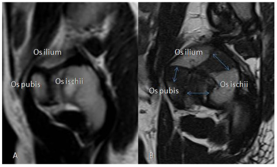 Magnetic resonance imaging (MRI) presentation of a widened tri-radiate cartilage of the acetabulum. MRI (T2 weighted, sagittal) of the tri-radiate cartilage of the left acetabulum (A) in a 5.6-year-old healthy male and (B) in a 6.7-year-old female ML intermediate patient (n 16) with widening of the cartilage (blue arrows).
