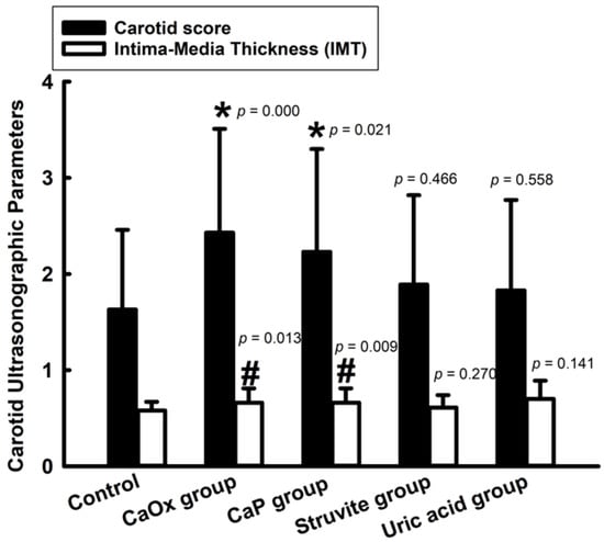 Carotid score and intima-media thickness (IMT) of carotid artery ultrasonographic scans in the different stone groups. *: p < 0.05 carotid score was significantly different when compared with the control. #: p < 0.05 IMT was significantly different when compared with the control. Abbreviation: CaOx, Calcium oxalate; CaP, Calcium phosphate.