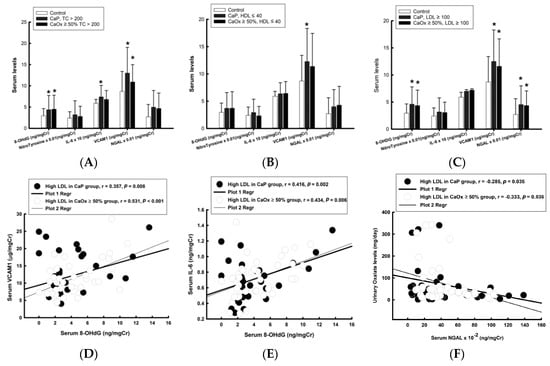 Serum markers of inflammation and oxidative stress compared to the controls in stone patients with CaOx and CaP, respectively. (The Nitro Tyrosine data was reduced 100X; IL-6 was magnified 10X, and neutrophil gelatinase associated lipocalin (NGAL) was reduced 100X from the original values in Figure 2A–C. (A), TC > 200, (B), HDL ≤ 40, (C) LDL ≥ 100. (D). Correlation between serum 8-OHDG and VCAM1; (E). Correlation between serum 8-OHdG and IL-6; (F). Correlation between urinary Oxalate level and serum NGAL level.
