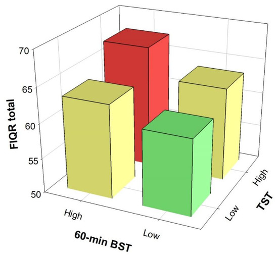 Combined effect of total sedentary time (TST) and 60-min bouted sedentary time (BST) on overall impact of the disease. Bonferroni’s post-hoc differences between the Low TST + Low BST and High TST + High BST groups (P = 0.002). Analysis controlled for age, bouted moderate-to-vigorous physical activity, overall physical fitness and accelerometer wear time. FIQR, Revised Fibromyalgia Impact Questionnaire.