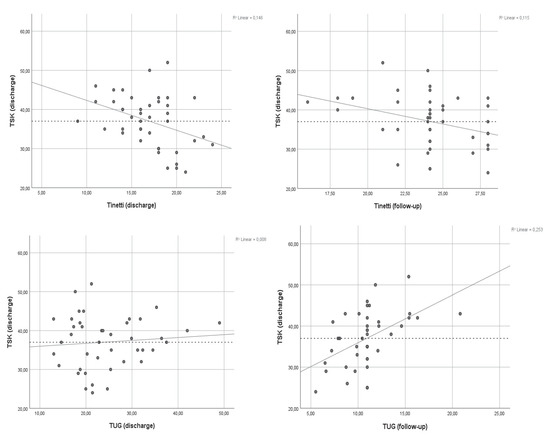 Scatter plots of the Tinetti and TUG test at discharge and follow-up are presented in Figure 1.