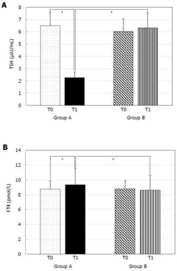 Thyroid-stimulating hormone (TSH) and free-thyroxine (FT4) before (T0) and six months after levo-thyroxine (LT4) or administration or no treatment (T1). Serum TSH levels (A) significantly decreased and serum FT4 (B) significantly increased after six months of LT4 administration at the dose of 1 µg/kg/day in Group A. * p < 0.05.