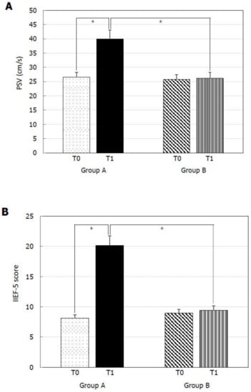 Peak systolic velocity (PSV) of the cavernous artery and International Index of Erectile Function 5-item (IIEF-5) score before (T0) and six months after levo-thyroxine (LT4) or administration or no treatment (T1). PSV (A) and IIEF-5 score (B) significantly increased in patients of Group A treated with LT4 for six months. * p < 0.05.
