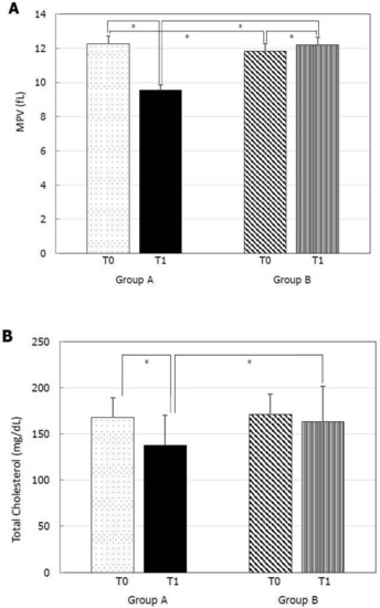 Mean platelet volume (MPV) and total cholesterol at before (T0) and six months after levo-thyroxine (LT4) or administration or no treatment (T1). Serum MPV (A) and total cholesterol (B) significantly decreased after six months of LT4 administration at the dose of 1 µg/kg/day in Group A. * p < 0.05.