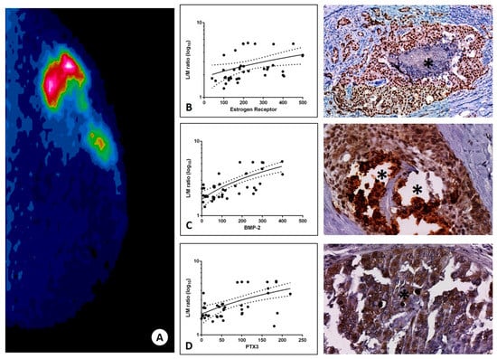 Association between [99mTc]Tc-Sestamibi uptake and the expression of bone biomarkers. (A) High [99mTc]Tc-Sestamibi uptake in a 53-year-old patient. (B) Graph shows a significant association between the estrogen receptor expression and the lesion to non-lesion ratio (r2 = 0.1527; p < 0.0208). Representative immunohistochemical image shows numerous estrogen positive breast cancer cells close to a microcalcification (asterisk). (C) Graph displays the positive association between sestamibi uptake and the number of BMP-2 positive tumor cells (r2 = 0.4953; p < 0.0001). Representative immunohistochemical image shows numerous estrogen positive breast cancer cells close to microcalcifications (asterisks). (D) Graph shows the significant association between the sestamibi uptake and the expression of PTX3 by cancer cells (r2 = 0.2975; p = 0.0003). High PTX3 expression of breast cancer cells next to a microcalcification (asterisk).
