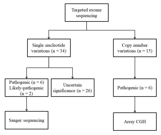 Through a literature review, 60 genes that had been reported to cause CAKUT in humans or murine models were selected (Table S1). We designed baits covering all exon regions of the targeted 60 genes (Twist Custom Panels; Twist Bioscience, San Francisco, CA). Genomic DNA was extracted from whole blood and sequencing libraries were prepared using Twist modular library preparation kits. Targeted sequencing was performed with 2x 101 bp paired-end reads on an Illumina MiSeq platform (Illumina, San Diego, CA). Bioinformatics analyses using sequenced reads were performed as previously described [22,23,24,25]. Variants were annotated with various information using ANNOVAR (Annotate Variation) [26] utilizing (i) population databases such as 1000 genome phase III, ExAC (Exome Aggregation Consortium), and KRGDB (Korean Reference Genome Database)(http://coda.nih.go.kr/coda/KRGDB/), (ii) disease databases such as OMIM (Online Mendelian Inheritance in Man) and sequencing databases such as RefSeqGene, and (iii) in silico predictive algorithms such as FATHMM (Functional Analysis through Hidden Markov Models), MutationAssessor, MutationTaster, SIFT, Polyphen, GERP, and Phylop for interpretation and classification of variants according to the American College of Medical Genetics and Genomics (ACMG) guidelines [27]. Workflow of prioritization and filtering the annotated variants is shown in Table S2. Variants classified as pathogenic or likely pathogenic based on ACMG guidelines were confirmed by Sanger sequencing (Figure 1). CNVs were calculated using aligned read counts in target regions by an in-house relative comparison method. Interpretation of detected CNVs was based on size, gene content, and overlap with known disease-associated regions according to the ACMG guidelines for postnatal CNV calling [28]. Classified pathogenic CNVs were re-confirmed by array comparative genomic hybridization (array CGH; Cytoscan 750k array; Affymetrix, Santa Clara, CA). Whenever possible, genotypes of relevant genes were obtained from the parents.