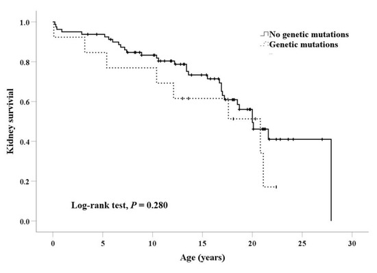 The types of genetic abnormalities did not significantly differ according to CAKUT phenotypes. Pathogenic variants were identified in three of nine patients with unilateral multicystic dysplastic kidney and other contralateral anomalies, with a relatively high detection rate. Bilateral anomalies of kidneys were more frequent in patients with pathogenic variants (76.9%) than those without pathogenic variants (51.9%), but the difference was not statistically significant (p = 0.091). Patients with pathogenic variants had syndromic features more frequently (84.6%) than those without variants (25.9%; p < 0.001; Table 3). Family history of CAKUT was rare in both groups with or without mutations. Perinatal problems also did not differ between the two groups. Kaplan–Meier survival curves showed that the presence of genetic mutations did not affect renal survival (Log-rank test, p = 0.280; Figure 2).