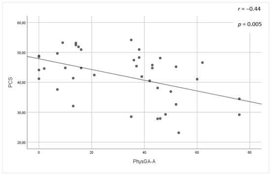 Relationship between physician global assessment of the disease activity (PhysGA-A) and physical component summary (PCS) of the Short Form-36 in localized scleroderma patients. p-value, r—Spearman’s rank correlation coefficient.