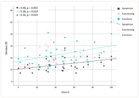 Relationship between patient global assessment of the disease damage (PtGA-D) and Skindex-29 in localized scleroderma patients. p-value, r—Spearman’s rank correlation coefficient.