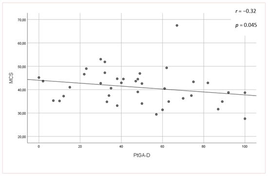 Relationship between patient global assessment of the disease damage (PtGA-D) and mental component summary (MCS) of the Short Form-36 in localized scleroderma patients. p-value, r—Spearman’s rank correlation coefficient.