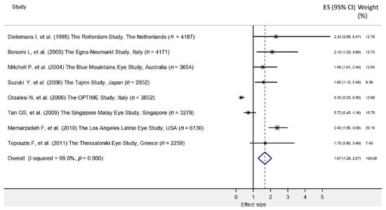Two authors (A.G. and M.O.) separately reviewed all searched articles to determine the eligible studies and the extracted data from the selected results. Any disagreements were resolved by adjudication. The data extraction was performed using a standardized data-collection form. Information was extracted as follows—the first author’s last name; publication year; country location; characteristics of study population (age, number of participants); number of POAG patients; methods for identification of risk factors for glaucoma in question; RR (or OR) from the most fully adjusted models and its corresponding 95% CI; and statistical adjustments for the confounding factors.