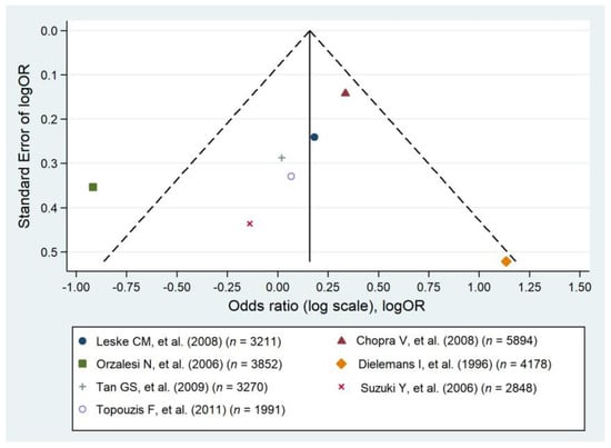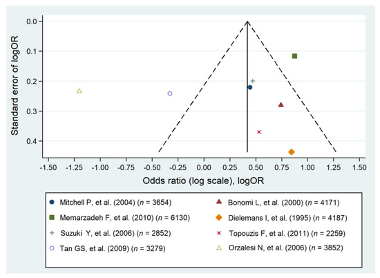 Funnel plot of cohort studies that evaluated arterial hypertension as a risk factor for primary open angle glaucoma [31,33,35,40,42,46,49,50].