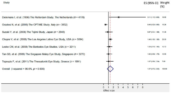 It was reported that DM is associated with an elevated IOP [53]; therefore, DM influence POAG by mediation of IOP. However, current evidence to support a direct relationship remains conflicting and is still not fully understood [6]. Seven population-based studies reported a statistically significant association between DM and POAG [34,38,41,46,48,49,51], but five studies did not confirm an association [31,32,36,42,43]. In the pooled analysis comprising seven original studies no significant relationship between the prevalence of POAG and DM was identified (pooled OR = 1.37; 95% CI: 0.72–2.02), and heterogeneity was high (I2 = 86.6%) (Figure 3 and Figure 4).