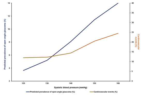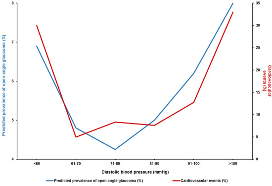 Abnormally low diastolic double product (dDP = DBP × heart rate) can be another marker of cardiovascular autonomic dysregulation, resulting in low ocular perfusion in NTG patients [72]. A positive correlation between SBP and the predicted prevalence of open angle glaucoma was reported in the Los Angeles Latino Eye Study [50]. A similar influence of SBP on cardiovascular risk factors was shown by the cardiovascular Ontarget trial (Figure 7) [73]. This study aimed to analyze the impact of systemic BP on cardiovascular events in well-treated, high-risk patients, enrolled in a large clinical trial. The analysis revealed that very high SBP was associated with glaucoma; moreover, a clear relationship between DBP and the predicted prevalence of OAG was observed (Figure 8) [50]. A very similar relation between DBP and cardiovascular risk (a so-called J-curve) was also observed in Coronary Artery Disease (CAD) patients, in the TNT study [74]. The TNT study showed that in patients with CAD, high DBP (>90–100 mmHg) and low DBP (<60–70 mmHg) portend an increased risk of future cardiovascular events. Randomized controlled trials of antihypertensive treatment provide strong evidence for J-shaped relationships between both DBP and SBP, and mortality (including all-cause mortality, cardiovascular mortality, nonfatal and fatal myocardial infarct, heart failure, stroke) in high-risk cardiovascular populations, including patients with CAD, DM, and left ventricular hypertrophy [75]. A similar J-shaped association was found between BP and glaucoma progression; patients with both high and low BP were at risk of glaucoma progression [76]. The treatment of HTN could also influence the risk of POAG; oral treatment with beta-blockers was shown to decrease the risk of POAG [77], while intake of calcium channel blockers (and particularly amlodipine) was associated with glaucoma severity and was found to increase the risk of POAG that required surgical intervention [78].