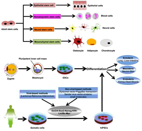 Representative figure illustrating stem cell types and their differentiation abilities. Reproduced from an article by Abdal Dayem et al. 2018 [143], an open access article distributed under the terms and conditions of the Creative Commons Attribution (CC BY) license (http://creativecommons.org/licenses/by/4.0/).