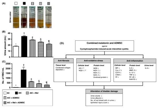 Effect and mechanisms of combination therapy with adipose-derived mesenchymal stem cells (AD-MSCs) and melatonin in cyclophosphamide (CYP)-induced acute interstitial cystitis (AIC). (A) The AIC group showed the highest urine turbidity and hematuria compared to the other groups. In contrast, the group treated with the combination of AD-MSCs and melatonin showed markedly lower urine turbidity than the groups treated with AD-MSCs or melatonin alone. This test was carried out for 72 h after AIC induction. (B) The urine amount was recorded on the last day of the 72-h period after AIC induction. (C) Number of red blood cells (RBCs) per mL of urine. (D) The mechanisms underlying the effects of the combination of AD-MSCs and melatonin in CYP-induced AIC therapy. These figures were reproduced from articles by Chen et al. 2014 [163] with permission from John Wiley and Sons. TGF-β1, transforming growth factor-beta 1. EB, embryoid bodies. HEMA, hydroxyethyl methacrylate. HO, heme oxygenase. iNOS, inducible nitric oxide synthase. NOX, NADPH oxidase. NF-κB, nuclear factor kappa-light-chain-enhancer of activated B cells. NQO, NAD(P)H quinone oxidoreductase. MMP-9, matrix metalloproteinases-9. IL, interleukin. AIC, acute interstitial cystitis. TNF-α, tumor necrosis factor-α. MIF, macrophage migration inhibitory factor. SP, substance P. RBCs, red blood cells. Down arrow, downregulation. Up arrow, upregulation.
