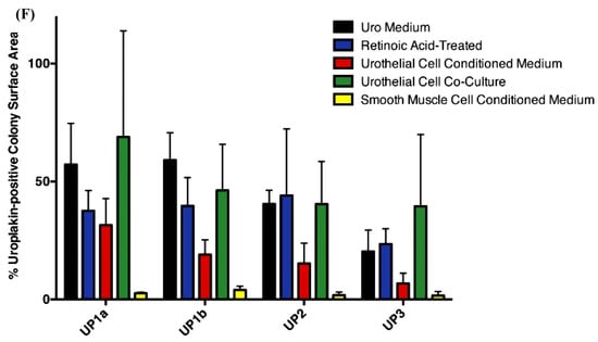 In 2013, Wu et al. reported that human umbilical cord-derived mesenchymal stromal cells (hUC-MSCs) differentiated into urothelium upon culturing with urothelial cell-derived CM containing 20 ng/mL exogenous EGF [146]. The expression of UPs and CK began one week after the initiation of differentiation, and significant increases in their expression were detected after two weeks.