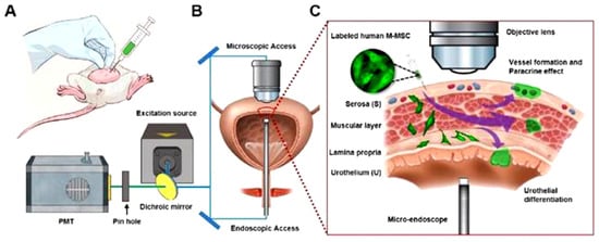 Diagram illustrating in vivo real-time tracking of transplanted M-MSCs in an IC/BPS rat by longitudinal intravital confocal fluorescence imaging. (A) Diagram illustrating the transplantation of M-MSCs via injection into the bladder wall. (B) Scheme displaying the process of monitoring the distribution, migration, and integration of the injected M-MSCs using the confocal imaging of the external bladder wall and micro-endoscopy of the internal bladder wall. (C) Representative diagram describing the migration of M-MSCs from the injection site (the serosa) to the lamina propria and urothelium. At first, M-MSCs differentiate into the urothelium to restore the damaged urothelium and then assimilate into blood vessel-like structures. This figure is reproduced from articles by Ryu et al. 2018 [177]. This is an open access article distributed under the terms of the Creative Commons Attribution (CC BY-NC) license (https://creativecommons.org/licenses/by-nc/4.0/).