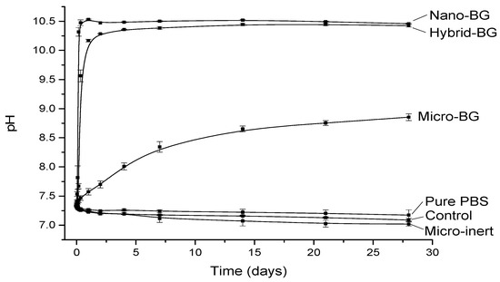The pH changes as a function of time are plotted in Figure 1. All BG-containing composites increased the pH, whereas a slight pH decrease was observed for pure PBS and composites without BG. The fastest pH rise was observed for the nano-BG composite, which increased to 10.5 within the first day of immersion and maintained this pH level throughout the 28-day period. The hybrid-BG composite demonstrated a slightly slower pH rise but eventually reached a similar final value as the nano-BG composite. A considerably slower pH increase and a lower final pH value (8.9) were observed for the micro-BG composite. At the end of the 28-day period, this material still showed a slight tendency of pH increase.