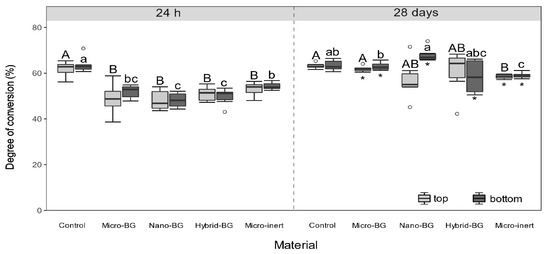 The comparison of MH between the top and bottom surfaces identified lower bottom values for hybrid-BG after 24 h and nano-BG after 28 days. These findings show that MH measurements were more capable of detecting curing heterogeneity through a 2 mm thick layer than DC measurements [51], which revealed no differences. The micro-inert composite showed significantly higher initial bottom MH, which is a phenomenon occasionally found in similar study designs [34] and is usually explained by the intrinsic heating within the composite specimen [52].