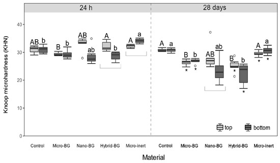 Knoop microhardness measured after 24 h and 28 days. Within each measuring time, same uppercase letters indicate statistically homogeneous groups for top surfaces, while same lowercase letters indicate statistically homogeneous groups for bottom surfaces. Asterisks (*) indicate significant differences between measuring times, within each material/surface combination. Square brackets indicate significant differences between the top and bottom surfaces.