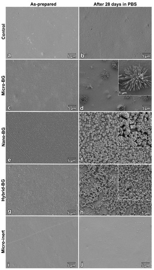 Scanning electron microscopy images of specimen surfaces immediately after preparation and after 28 days of storage at 37 °C in phosphate-buffered saline (PBS) for the control (a,b), micro-BG (c,d), nano-BG (e,f), hybrid-BG (g,h), and micro-inert composites (i,j). Insets show higher magnification of crystals formed on specimen surfaces.