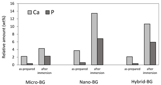 Figure 5 shows the EDX data collected from the surface of BG-containing composites. An increase in calcium and phosphorus concentrations indicative of calcium phosphate precipitation was observed after 28 days of PBS immersion. The increase in calcium and phosphorus concentrations was more pronounced for the nano-BG and hybrid-BG composites compared to the micro-BG composite. The Ca/P ratio in the range of 1.39–1.52 suggests that the precipitate was calcium-deficient hydroxyapatite. On the surfaces of the control and micro-inert composites, no measurable amounts of calcium and phosphorus were detected both before and after PBS immersion.