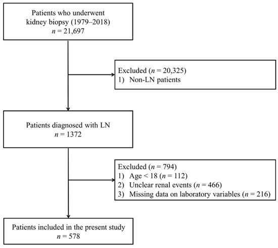 Of the 21,697 patients who underwent kidney biopsies from January 1979 until October 2018 at 18 Korean university hospitals (Kyungpook National University Hospital, Kyung Hee University Hospital at Gandong, Kangdong Sacred Heart Hospital, Gangnam Severance Hospital, Korea University Guro Hospital, Korea University Anam Hospital, Eulji University Hospital, Seoul National University Boramae Medical Center, Seoul National University Bundang Hospital, Seoul National University Hospital, Severance Hospital, Pusan National University Yangsan Hospital, The Catholic University of Korea, Eunpyeong St. Mary’s Hospital, Ewha Womans University Mokdong Hospital, National Health Insurance Service Ilsan Hospital, Chonnam National University Hospital, Chonbuk National University Hospital and Hallym University Sacred Heart Hospital), 1372 patients were diagnosed with LN. We excluded 112 patients aged <18 years, 446 patients who did not know whether renal events had occurred, and 216 patients whose serum UA levels were not measured. Finally, the data from 578 patients were retrospectively analyzed (Figure 1).