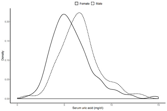 Difference in distribution of serum uric acid by sex. The median of serum uric acid level was 6.5 mg/dL in men and 5.4 mg/dL in women.