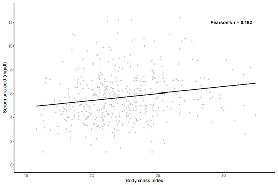 Association between body mass index and serum uric acid. Body mass index and serum uric acid showed positive correlation.