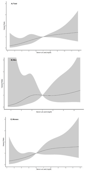 Restricted cubic spline curve of hazard ratio of serum uric for progression of lupus nephritis. Serum uric acid levels and progression of lupus nephritis showed a nonlinear relationship in total patients (A), in men (B), and in women (C).