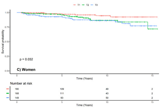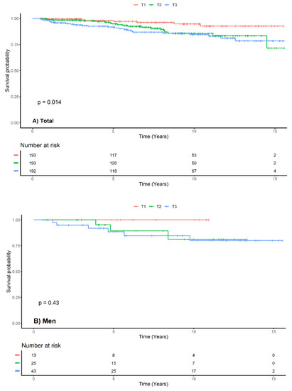 Kaplan–Meier survival curve with log-rank test between progression of LN and serum uric acid by sex. Kaplan–Meier survival curve for total patients (A), men (B) and women (C). Hyperuricemia was associated with progression of LN in total and women but not in men. The range of serum uric acid of terciles is 3.8 ± 0.8 mg/dL in T1, 5.6±0.5 mg/dL in T2 and 8.3 ± 1.9 mg/dL in T3 respectively. T1, tercile 1; T2, tercile 2; T3, tercile 3.