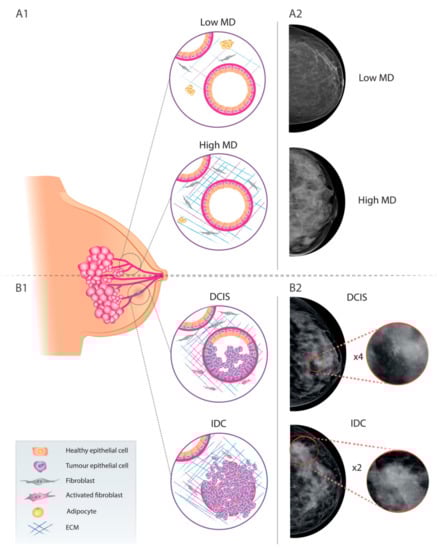 Schematic representation of mammary gland organisation and representative mammograms of healthy breast tissue, including low (A1) and high (A2) mammographic density areas; and malignant lesions, including DCIS (B1) and IDC (B2). MD: mammographic density; DCIS: ductal carcinoma in situ; IDC: invasive ductal carcinoma.