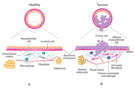 Schematic model of breast epithelium and its stroma. Major changes in cell types and in extracellular matrix (ECM) between: (A) healthy mammary gland and (B) invasive breast carcinoma are depicted.