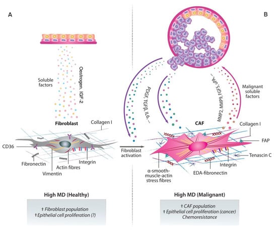 Fibroblasts are the most abundant and active cell population of the breast stroma and so partially responsible for high MD. Besides, it is becoming increasingly clear that they are also prominent modifiers of cancer progression []. Activated fibroblasts are known as cancer-associated fibroblasts (CAFs) and are thought to be involved in tumour growth and metastasis []. CAFs can affect the phenotype of epithelial cells in a variety of ways, from cell-to-cell contacts to the secretion of aberrant soluble molecules of by altering critical ECM components []. It is well-known that alterations in stromal composition correlate with increased MD and it has been suggested that the numerous fibroblasts responsible for areas of high MD may be secreting soluble factors that would be inducing epithelial cell proliferation [] (Figure 3A).