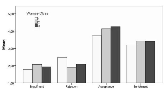 Looking at between-subjects’ effects in Table 4, the main effects in the Warnes classification do result from significant group differences regarding the dependent variable of acceptance (F (2, 206) = 5.41, p < 0.01, η2P = 0.05). However, no significant differences could be found for the dimensions of engulfment, rejection and enrichment. Post-hoc analysis using the Tukey-HSD-test revealed significant differences in rejection between the mean scores of Warnes classes 1 (M = 2.47, SD = 0.95) and 2 (M = 1.90, SD = 0.91) on the 1%-level. However, no significant differences were observed between classes 1 and 3 (M = 2.08, SD = 0.91) or 2 and 3 (p > 0.05). There were significant differences between the Warnes classes 1 (M = 3.72, SD = 1.01) and 2 (M = 4.13, SD = 0.99), as well as 1 and 3 (M = 4.25, SD = 0.86) regarding their mean scores in acceptance. Thus, there is a tendency for rejection decreasing and acceptance increasing with higher Warnes classes (see Figure 2).