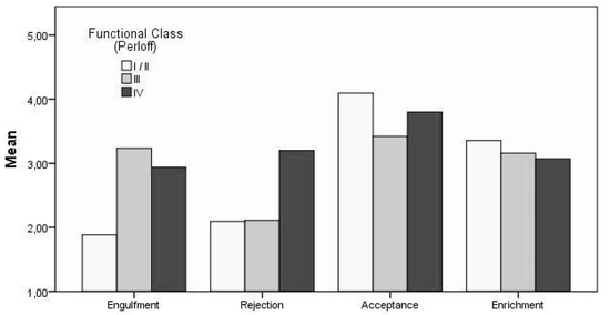 The main effect regarding functional class was found on the dimension of engulfment (F (2, 206) = 10.56, p < 0.01, η2P = 0.09). Similar to the results of the Warnes classification, no significant differences were observed on the other remaining dimensions (p > 0.05). Post-hoc comparisons using the Tukey-HSD-test likewise indicated that the mean engulfment-score for functional class 1 (M = 1.88, SD = 0.97) differed significantly from the mean score of functional class 3 (M = 3.23, SD = 1.19). However, no significant differences were observed for engulfment between functional class groups 1 and 4 (M = 2.93, SD = 1.50) or groups 3 and 4, respectively (p < 0.05). Thus, higher functional impairment is positively related to stronger engulfment (see Figure 3). However, higher cardiac severity according to Warnes Classification correlates with increased acceptance and decreased rejection within the present sample.