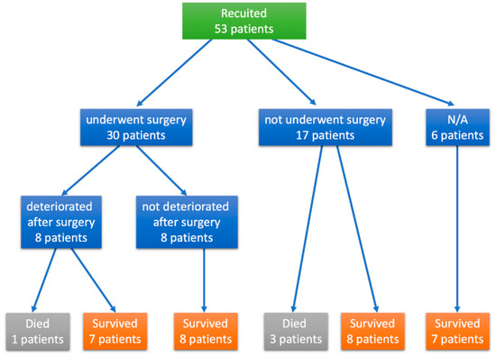 Flowchart of included and excluded patients. Thirty patients underwent surgery and the condition of 8 worsened postoperatively. Adverse events were noted in 4 patients.