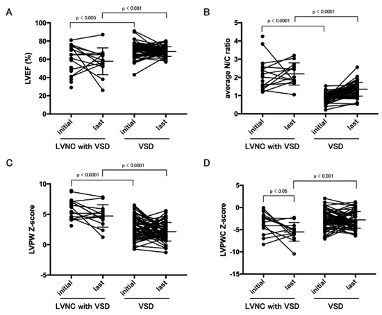 Longitudinal data of echocardiographic data between LVNC with CHD and VSD groups. LVEF (A), average N/C ratio (B), LVPW z-score (C), and LVPWC z-score (D) between the initial and last visits. LVNC; left ventricular noncompaction, VSD; ventricular septal defect, LVEF; left ventricular ejection fraction, N/C; ratio of noncompacted/compacted layer, LVPW; left ventricular posterior wall, LVPWC; compacted layer of left ventricular posterior wall.